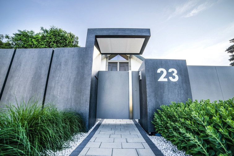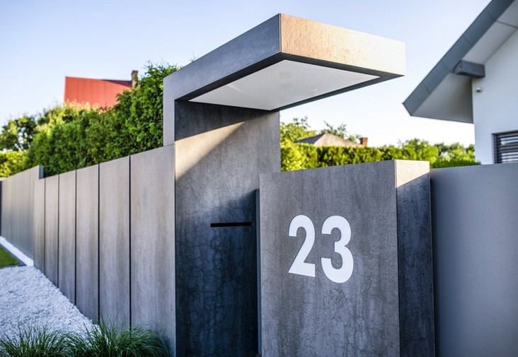Bei der Implementierung haben wir vertikale Aluminium-Poller Arete Vertico verwendet. Arete Pure Eingangstür und Tor basieren auf einem glatten Blech, das zum Rest des Zauns passt. Die Überdachung des Grundstückseingangs und die Rockin Cubero-Blöcke wurden mit Sinterquarz bedeckt. Sie bilden keine vollständige Wand, sondern sind durch enge Lücken voneinander getrennt, die nachts mit spezieller Beleuchtung wirkungsvoll hervorgehoben werden. Diese Löung erhöhte die visuelle "Leichtigkeit" der Struktur.